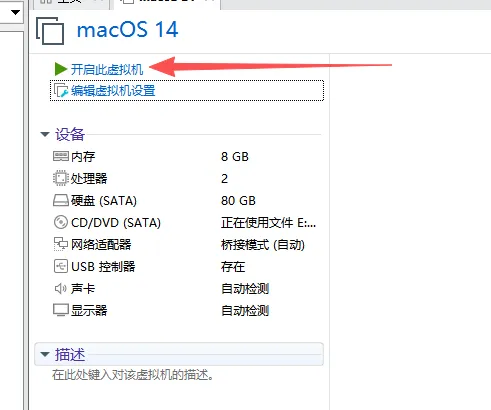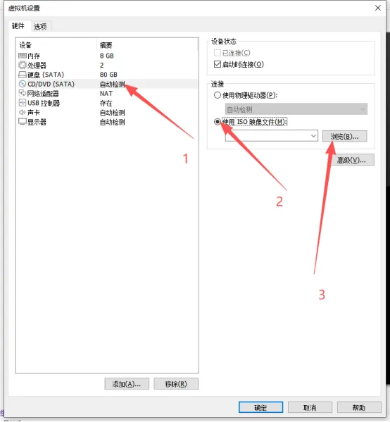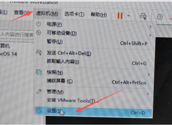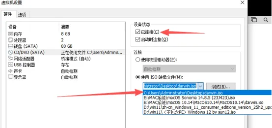 十六.点击虚拟机下拉菜单的”设置“,然后点击”CD/DVD (SATA)“镜像选择刚刚下载的darwin.iso,然后点击确定。