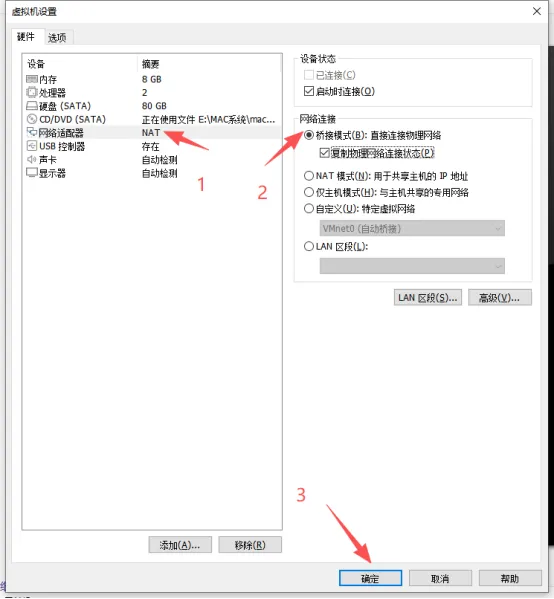 十一.选择镜像,网络选择桥接模式,确定后,然后点击开启虚拟机,等待安装,然后设置。