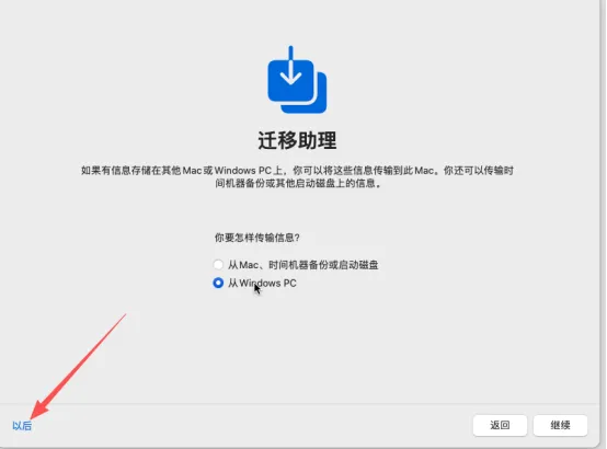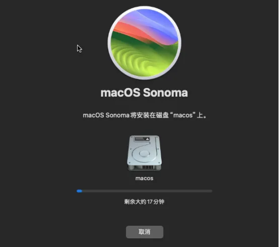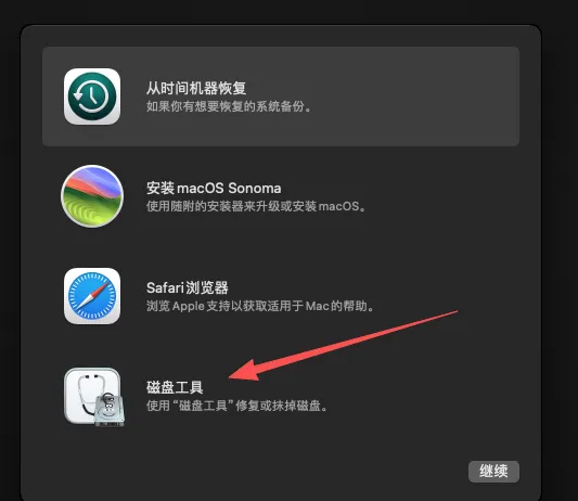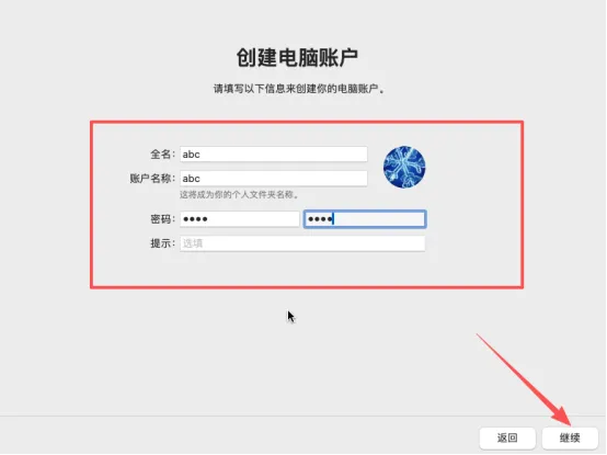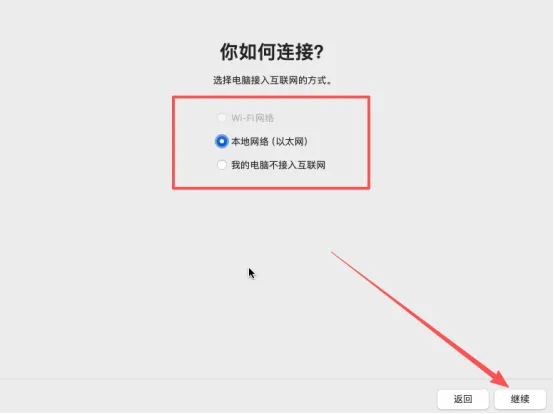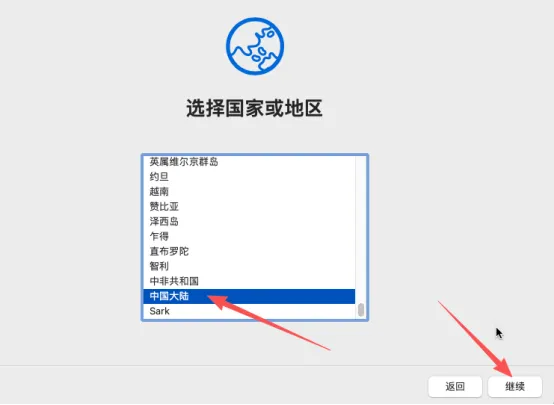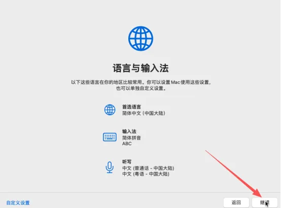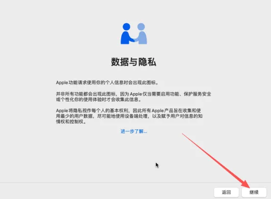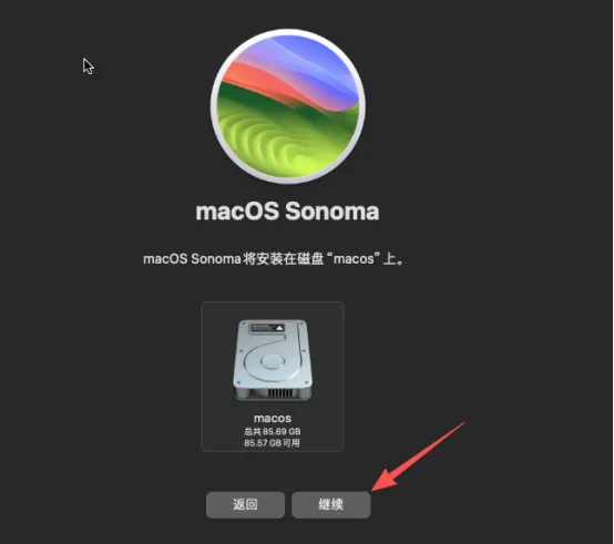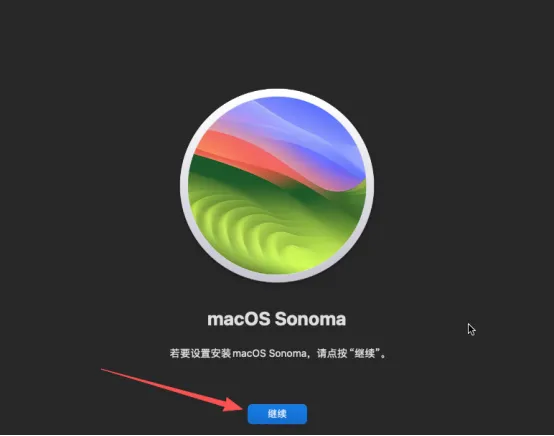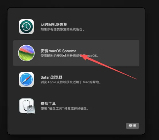 十四.返回到这个页面选择安装macOS,然后点击继续,等待安装,其他的设置按需设置。