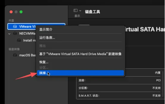 十三.我们要先把之前划分给macOS硬盘抹掉(点击第一个,然后右击抹掉),名称自行起一个就可以了,完成后点击关闭这个页面。