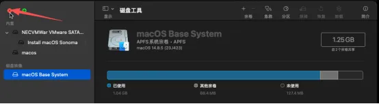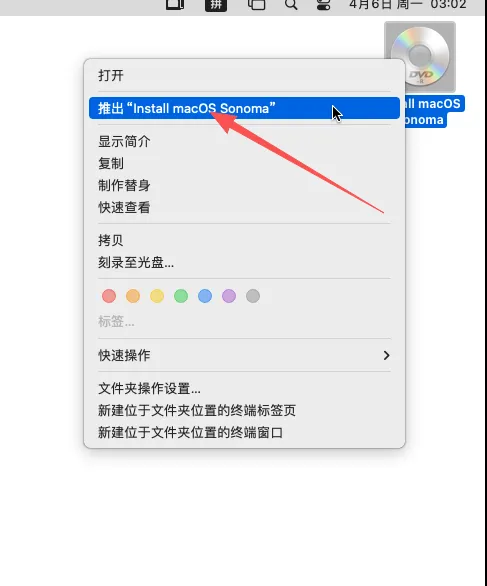 十五.到这个页面时候,输入刚刚设置的密码进入系统,可以看到页面显示不全,两边有黑边,需要安装VMware Tools(需要先去官方下载packages-prod.broadcom.com/tools/frozen/darwin/darwin.iso,也可以用小篇提供的安装包darwin.iso),下载完毕后,在macOS系统里面桌面找到这个光盘图标,然后右击选择”推出 "Install macOS Sonoma“。