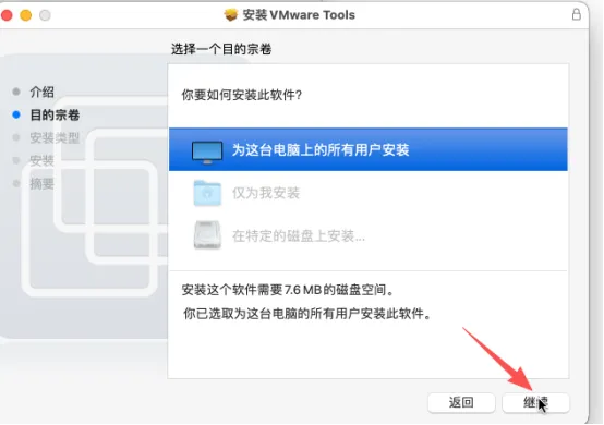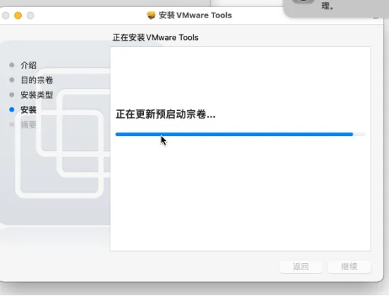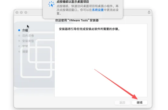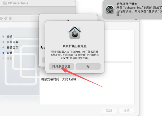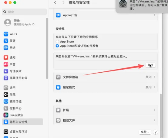 十七.进入到macOS里面点击弹窗里面的"VMware Tools"进行安装就可以了,出现拦截再点击设置一下”允许“,继续安装完毕。页面就可以全屏了,如果没有生效,重启一些macOS系统就可以了。