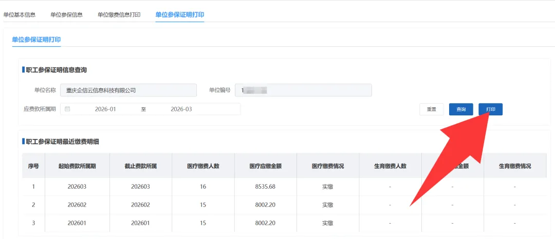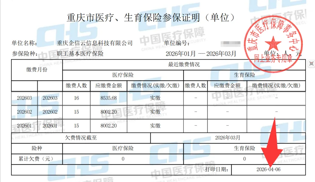 请收藏,本月起重庆市医保明细与参保证明下载路径有变近期,有很多人通过微信群咨询医保的缴费明细如何下载;经过小编按原来的路径即通过重庆市医疗保障局官网登录重庆市医疗保障局公共服务平台后发现,显示医保网上服务大厅已经在升级维护,并提示前往渝快办(也就是重庆市政务网)办理医保业务。于是,我专门为大家整理了医疗保障相关业务的办理路径。这里主要是讲解缴费明细的下载与参保证明的打印方式:第一步:登录重庆市政务网法人账户(也就是单位账户),并在首页搜索“基本医保参保单位参保信息查询”第二步:页面跳转后,我们直接选择【基本医保参保单位参保信息查询】的在线办理的导航按钮第三步:此时页面就会跳转到具体的信息查询界面,显示了【单位基本信息查询】、【单位参保信息】、【单位缴费信息打印】、【单位参保证明打印】,就是可以查询单位的参保区县、联系人、缴费状态、实际缴费的明细、参保证明能显示参保人数即缴费状态的信息。特别说明:单位缴费信息打印实际是缴费明细的下载,我们能导出excel表,选择对应的月份即可下载,这里能导出的明细是已经完成缴费实际到账的数据,例如小编4月6日下载4月份的缴费明细,因为目前还没有缴费,导出的excel表只有标题行,没有实际数据。如图所示,导出的2026年3月的缴费明细,每个人有3行数据,我们需要关注的长期照护保险这个数据,其金额是缴费基数的0.1%,这个金额是不需要通过我们的工资去扣缴的,而是系统自动会通过个人缴费账户的基本医疗保险那2%的额度中扣缴,所以按照国家最新的缴费政策,个人医疗保险账户(我们俗称的医保卡)每个月到账金额不足那2%,即按照最低基数4404计算,到账金额没有88.08,因为我们每个月还需要从这88.08元当中去扣缴4.4元缴纳长期照护保险。参保证明打印:经办人可以选择需要打印的周期,然后即可查询显示下载后的医疗保险参保证明格式如下: