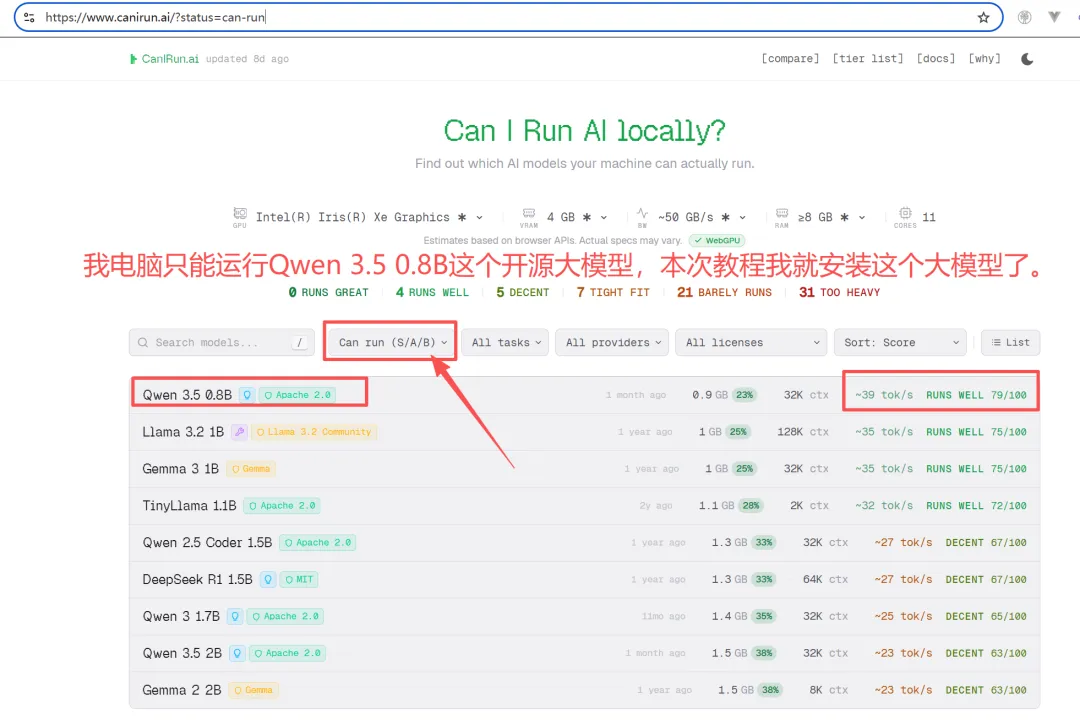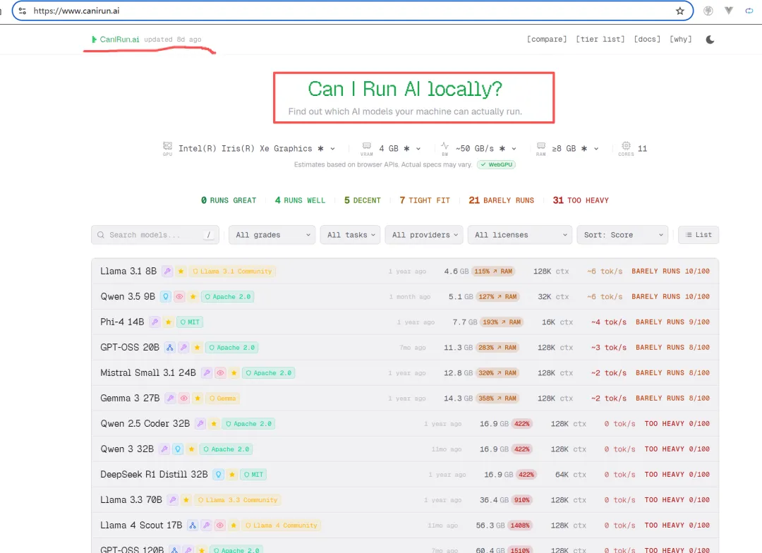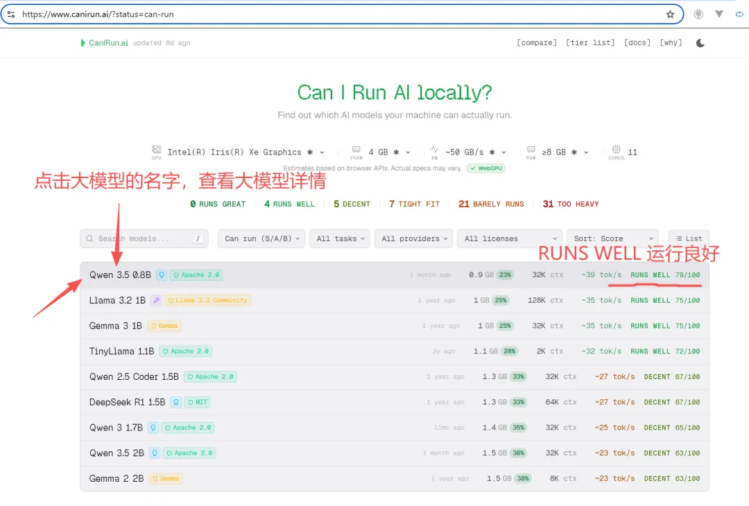 要在电脑上部署本地大模型,首先需要确认你的电脑配置能够运行哪款大模型。访问这个网站canirun[1],看看你的电脑配置能跑起来哪种大模型?