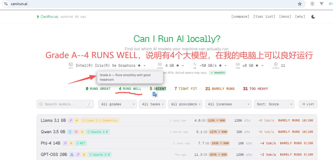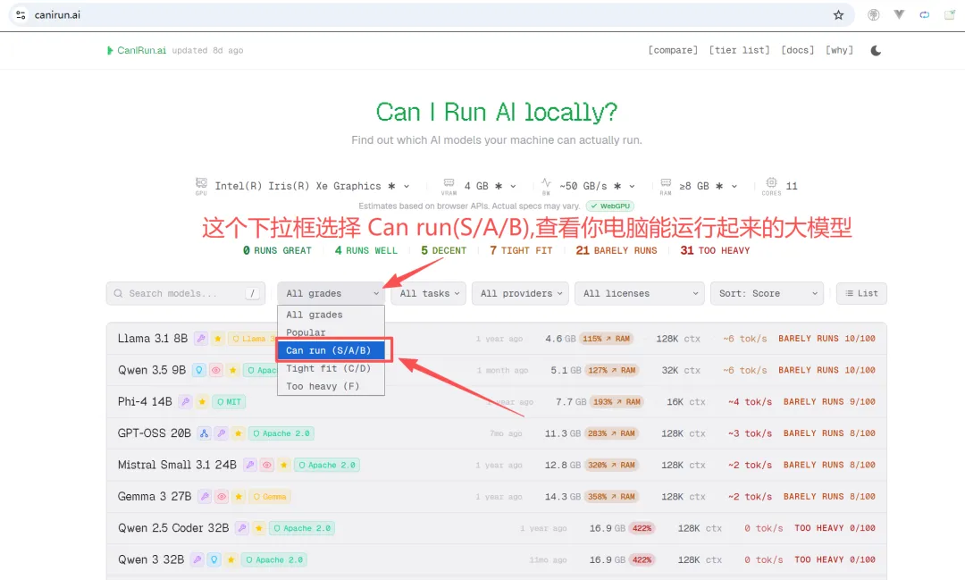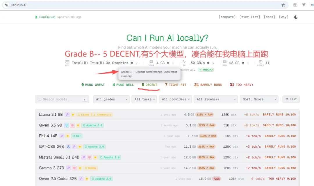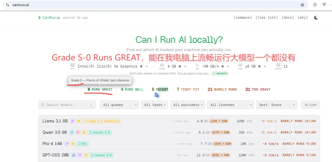 该网站会读取你的电脑配置,并基于配置对所有开源大模型进行分级。S级为最适配你电脑的大模型(可流畅运行),A级为适配性良好的大模型(可正常运行),B级为你的电脑勉强能运行的大模型。还有C级、D级、F级,这几个级别的大模型你本地电脑基本上运行不起来。
