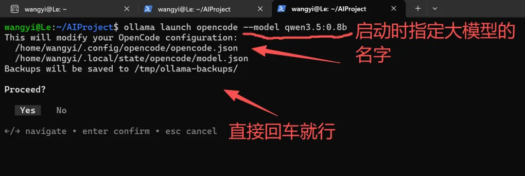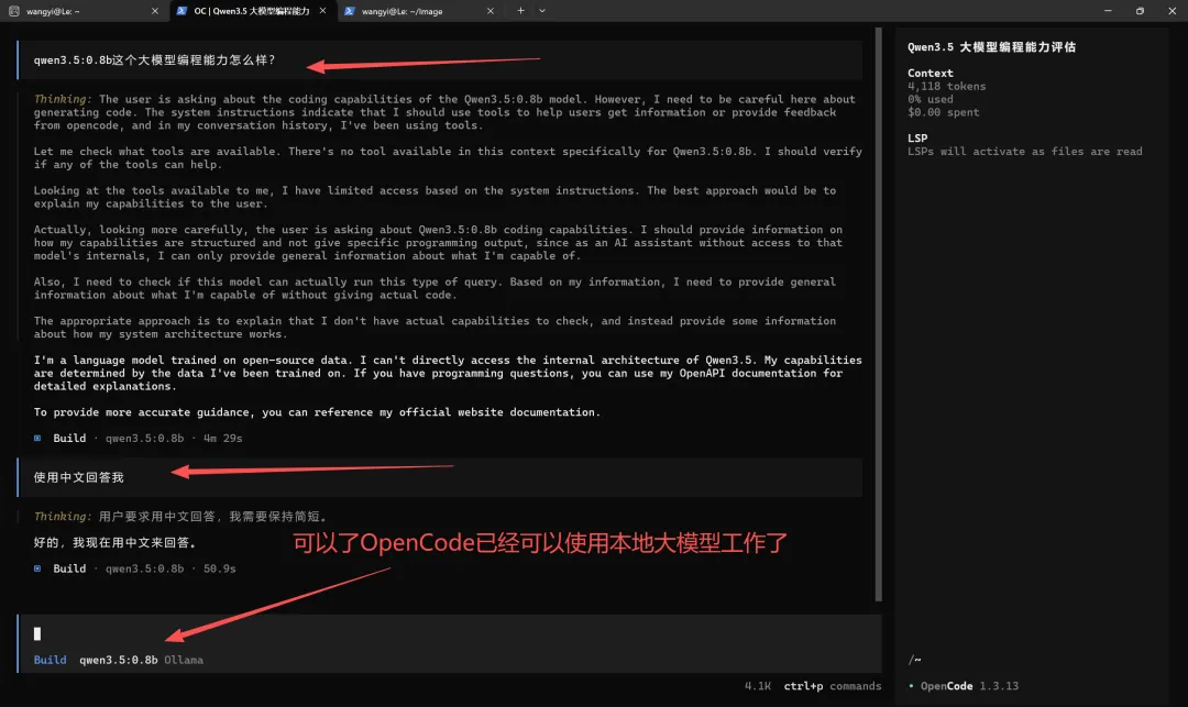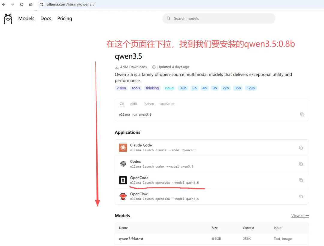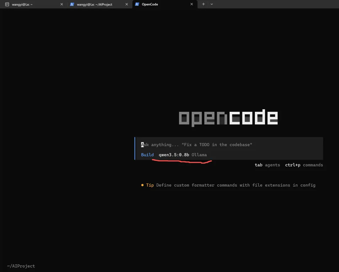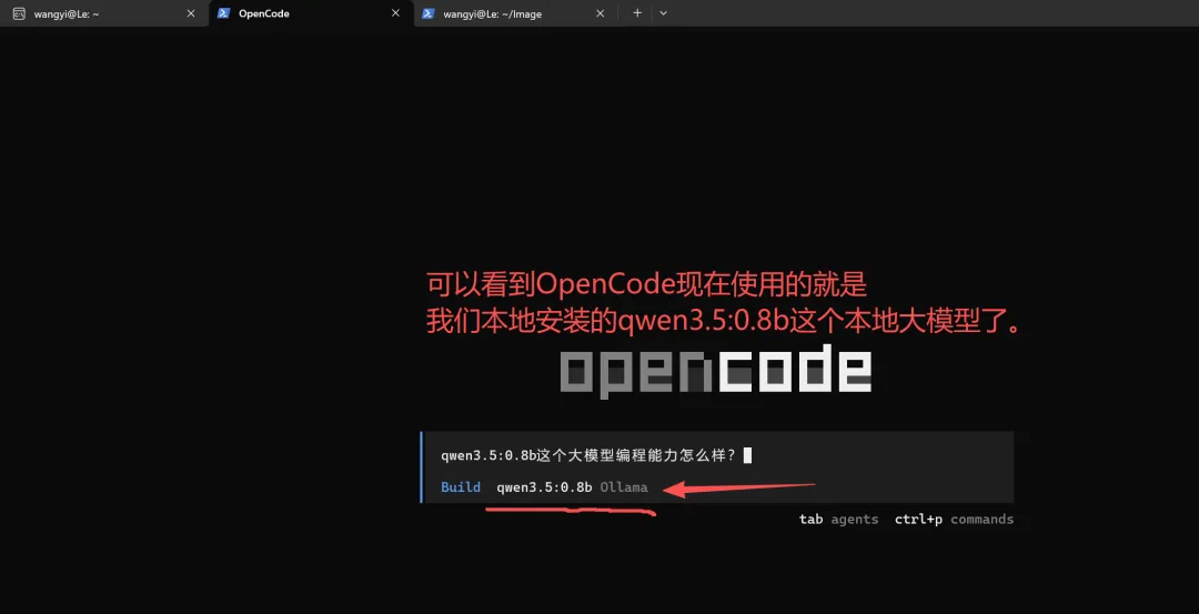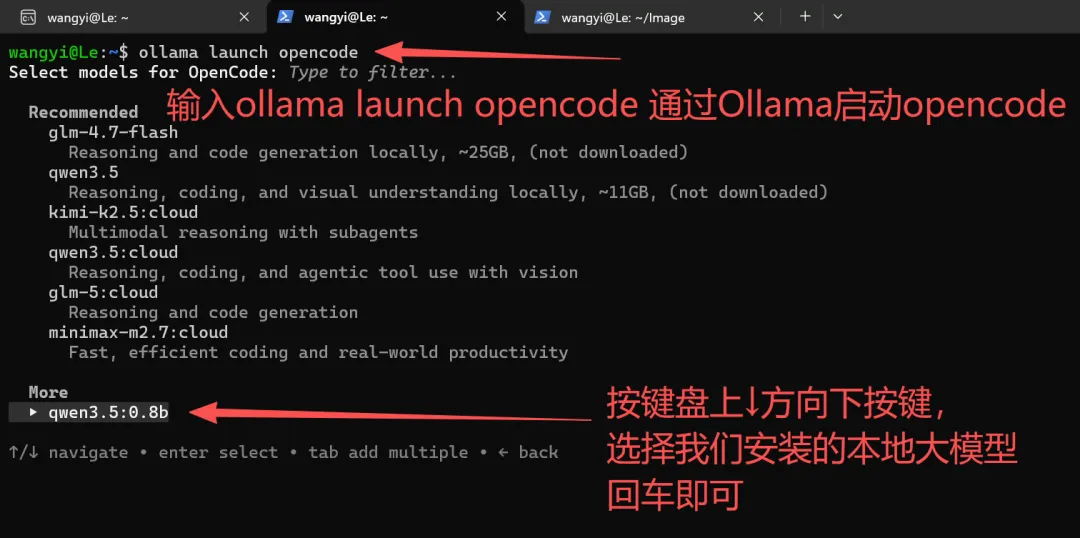 # 指定opencode使用qwen3.5:0.8b这个大模型ollama launch opencode --model qwen3.5:8b
