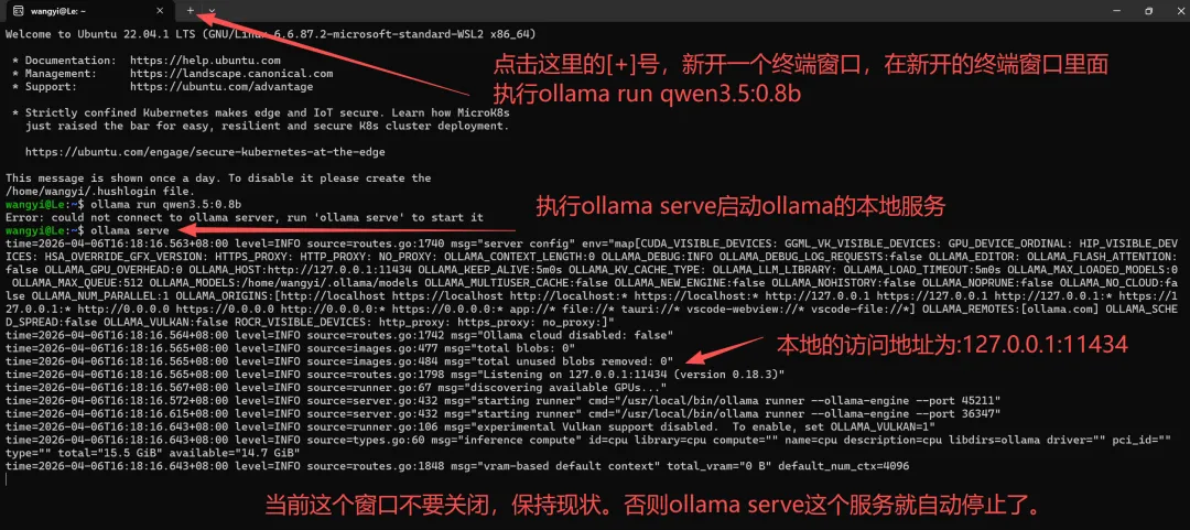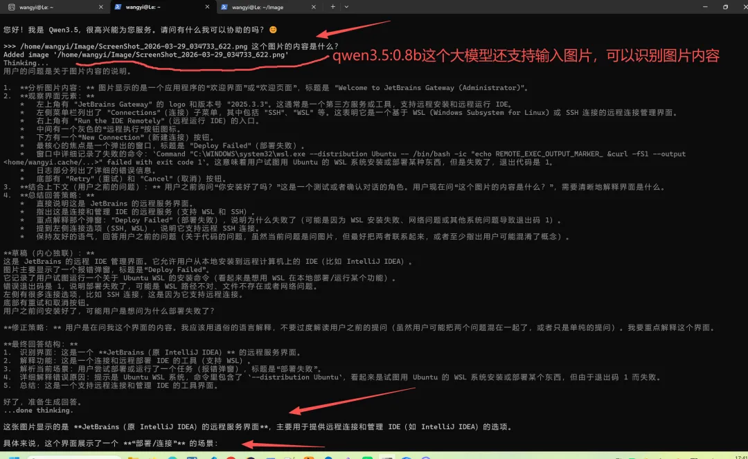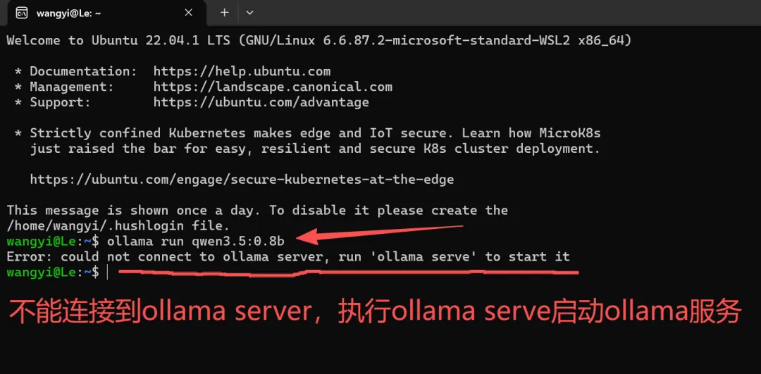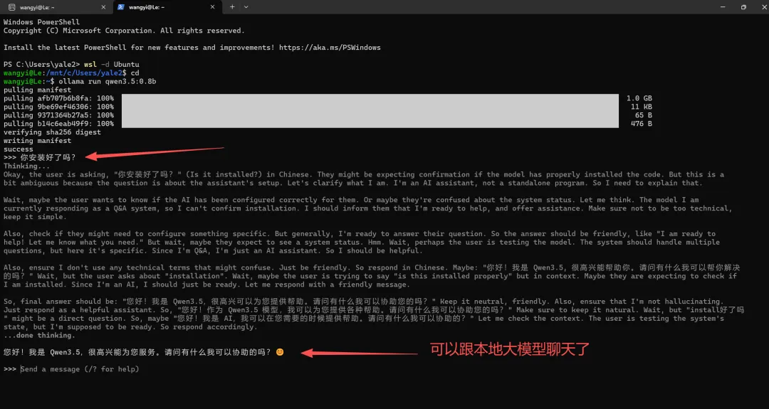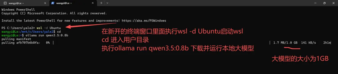 # 启动WSLwsl -d Ubuntu# cd命令进入用户的home(家)目录cd# 下载并安装运行qwen3.5:0.8b这个大模型ollama run qwen3.5:0.8b