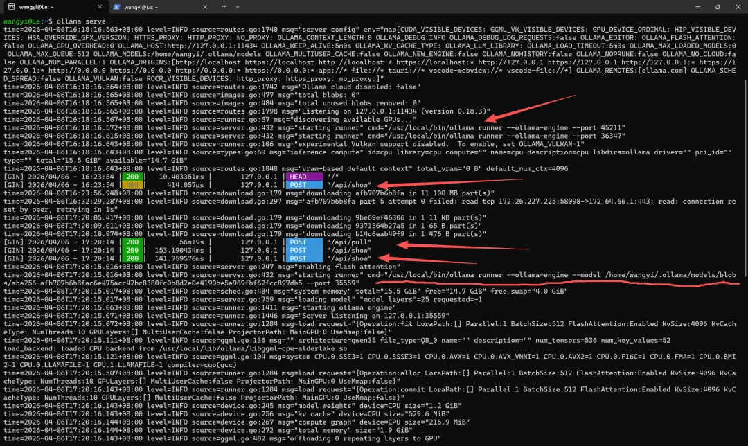 从上图可看出,要在本地安装大模型,需先执行 ollama serve 命令,在本地启动 Ollama 服务进程。