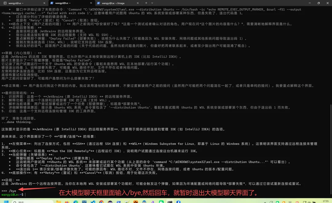 /bye:在聊天界面输入/bye,就可以暂时退出大模型的聊天界面。