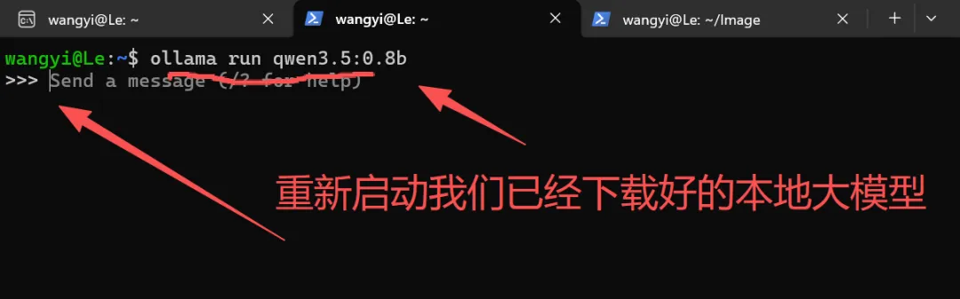 # 重新启动qwen3.5:0.8b这个大模型ollama run qwen3.5:0.8b