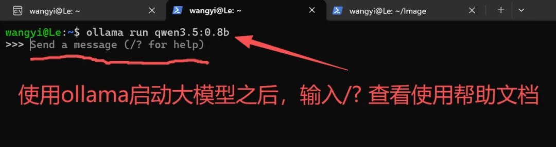 我们使用ollama run qwen3.5:0.8b这个命令启动本地大模型之后,ollama会给我们一个提示:“输入/? 获取帮助”,输入斜杠+问号:/?。