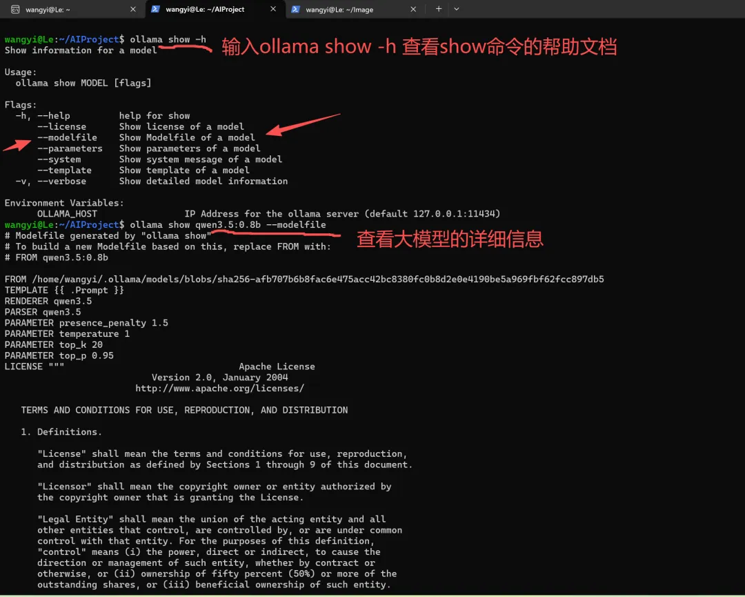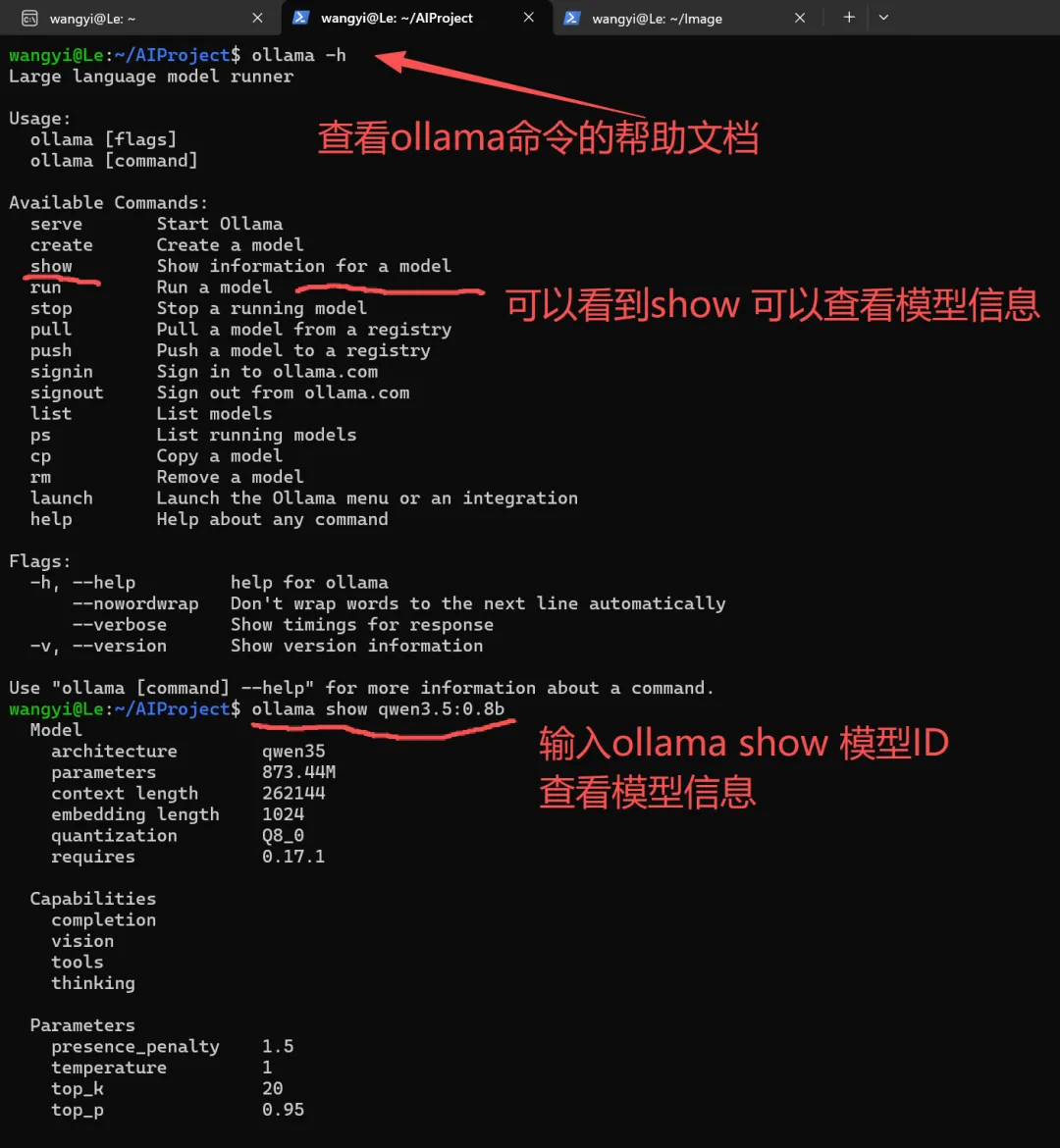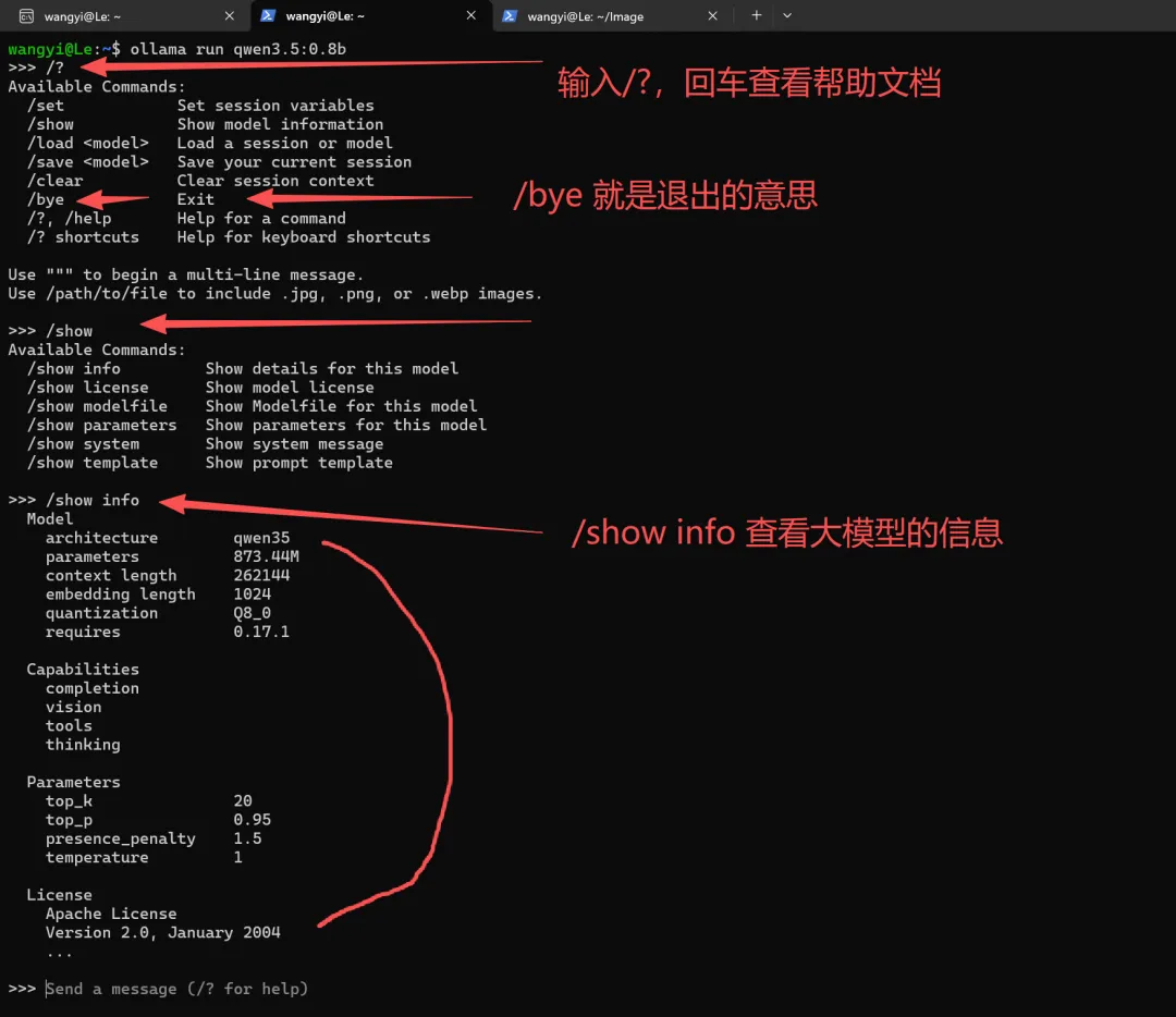 # 查看大模型的详细信息ollama show qwen3.5:0.8bollama show qwen3.5:0.8b --modelfile