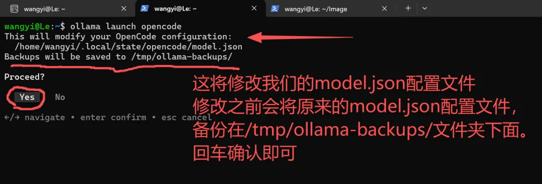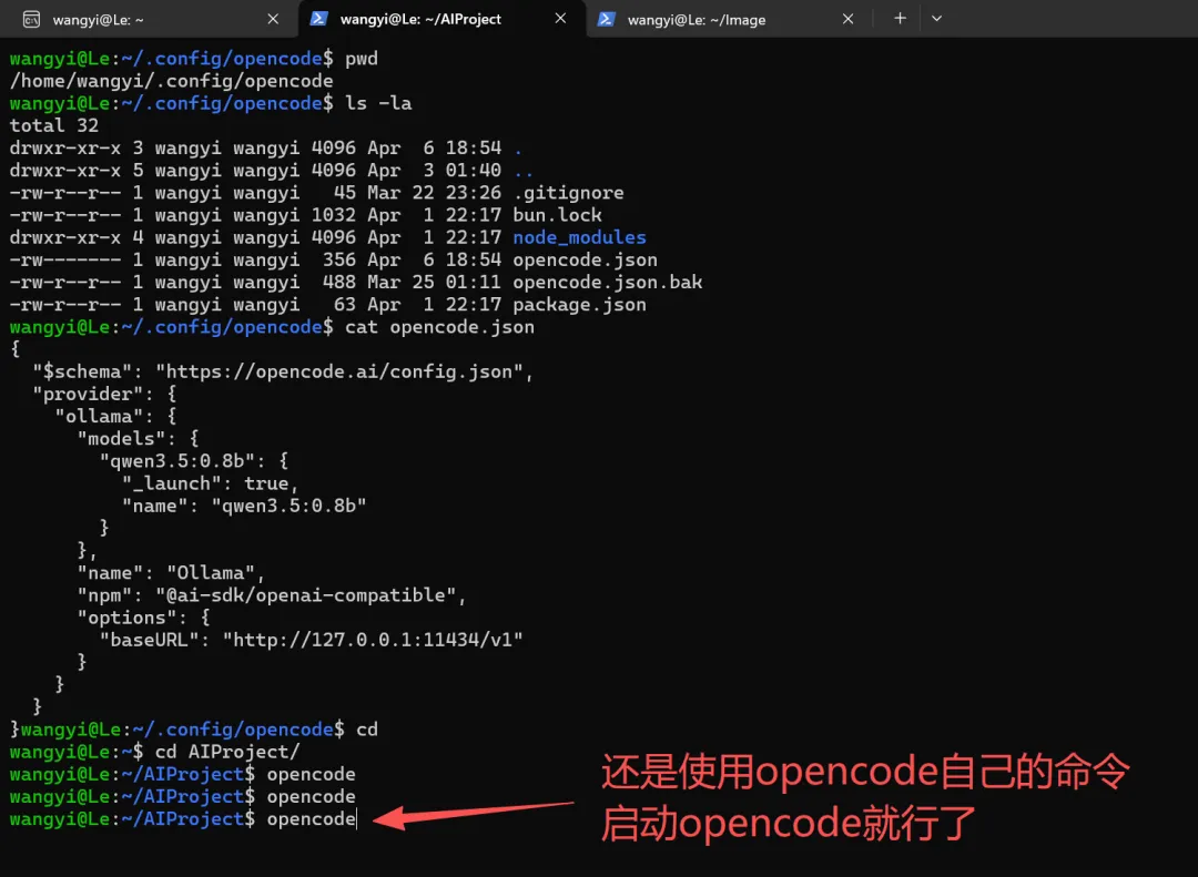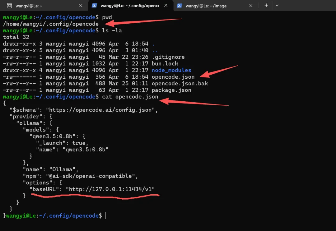 # 使用cd 命令进入用户的 home(家)目录cd /home/wangyi/.config/opencode# 使用cat命令查看opencode.json配置文件cat opencode.json