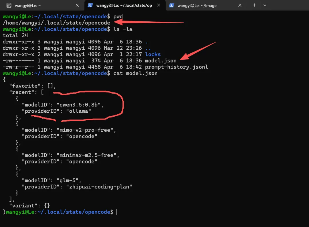 # 使用cd命令进入opencode的配置文件所在目录cd /home/wangyi/.local/state/opencode# 使用cat 命令查看model.json配置文件cat model.json