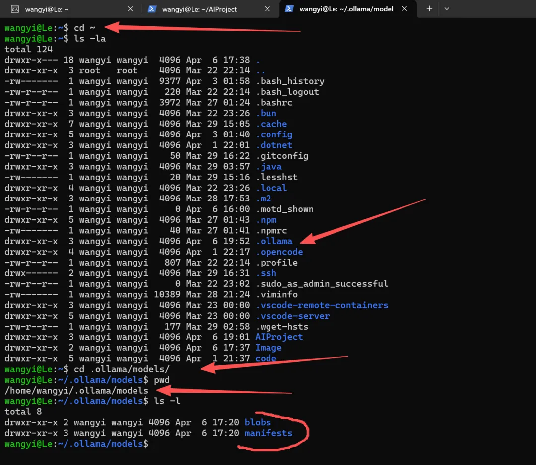 # ~这个符号代表当前登录用户的home(家)目录cd ~/.ollama/models/# 查看目录下的文件列表ls -la