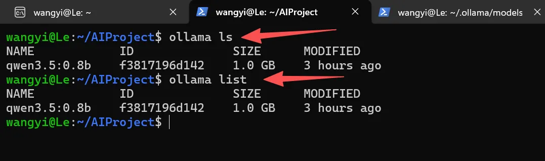 # 查看本地都安装了哪些模型ollama ls# ls是list的缩写ollama list