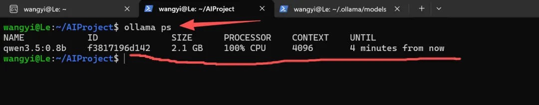 以下命令会执行两个操作:首先检测本地是否已下载 qwen3.5:0.8b 大模型;若已下载,则直接运行该模型;若未下载,则先下载模型,下载完成后自动运行。