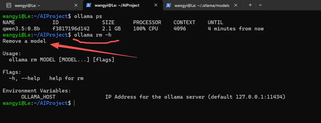 # 删除本地安装的大模型,rm是remove删除的意思ollama rm qwen3.5:0.8b