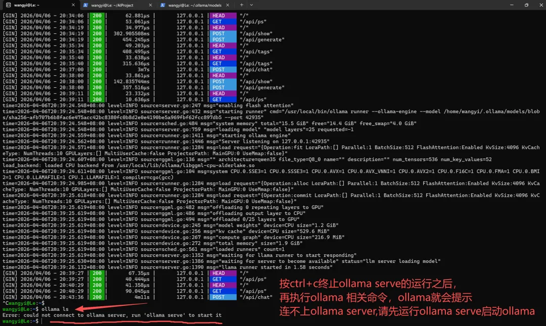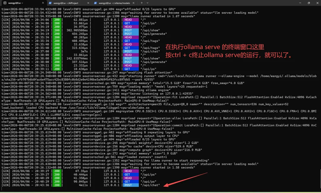 在执行ollama serve的终端窗口上按ctrl + c命令,终止ollama serve服务。