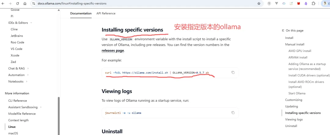 # 安装或更新指定版本的ollamacurl -fsSL https://ollama.com/install.sh | OLLAMA_VERSION=0.5.7 sh