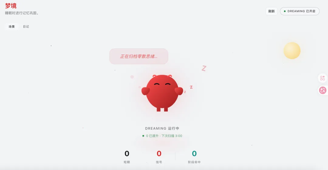 /dreaming offWeb UI 查看:在 OpenClaw 的控制面板里有一个 Dreams 选项卡,里面可以看到精美的动画和详细的梦境进度。