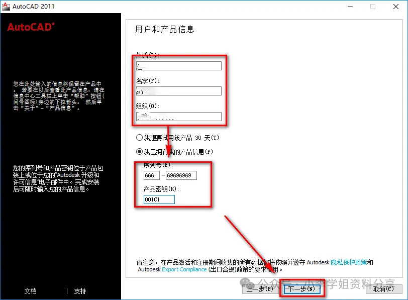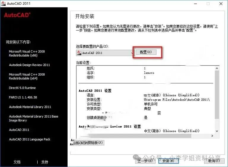 7.姓氏、名称、组织随便填,序列号:666-69696969,产品密钥:001C1,点击“下一步” ![]() 8.点击“配置” ![]() 9.点击“下一步”