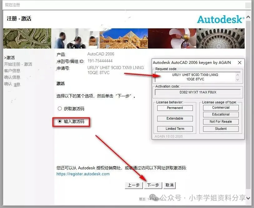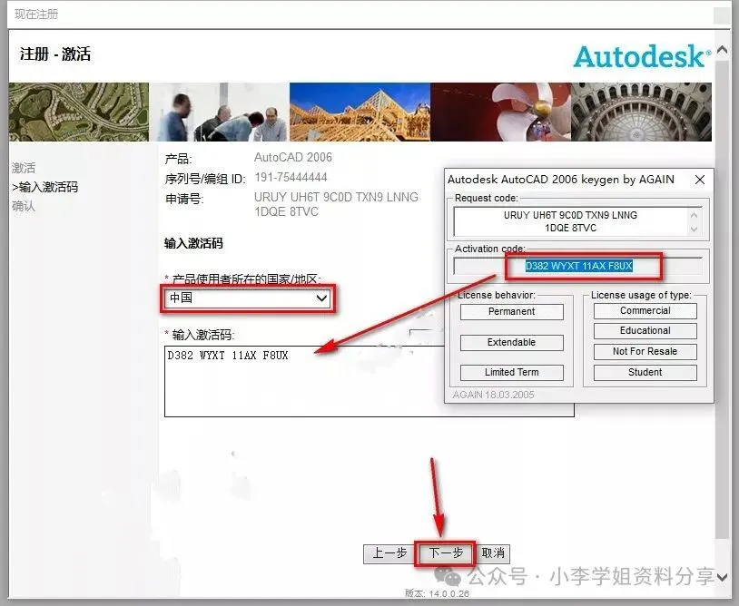 温馨提示:若打开没有注册机,说明被电脑杀毒软件隔离了,关闭杀毒软件重新解压即可。 19.将申请号复制到Request code输入框中,选择输入激活码,点击“下一步” 注:复制和粘贴只能用快捷键"Ctrl+C"和”Ctrl+V” ![]() 20.国家选择中国,将生成的激活码复制到激活码输入框,点击“下一步” 注:复制和粘贴只能用快捷键"Ctrl+C"和”Ctrl+V” ![]() 21.点击“完成”