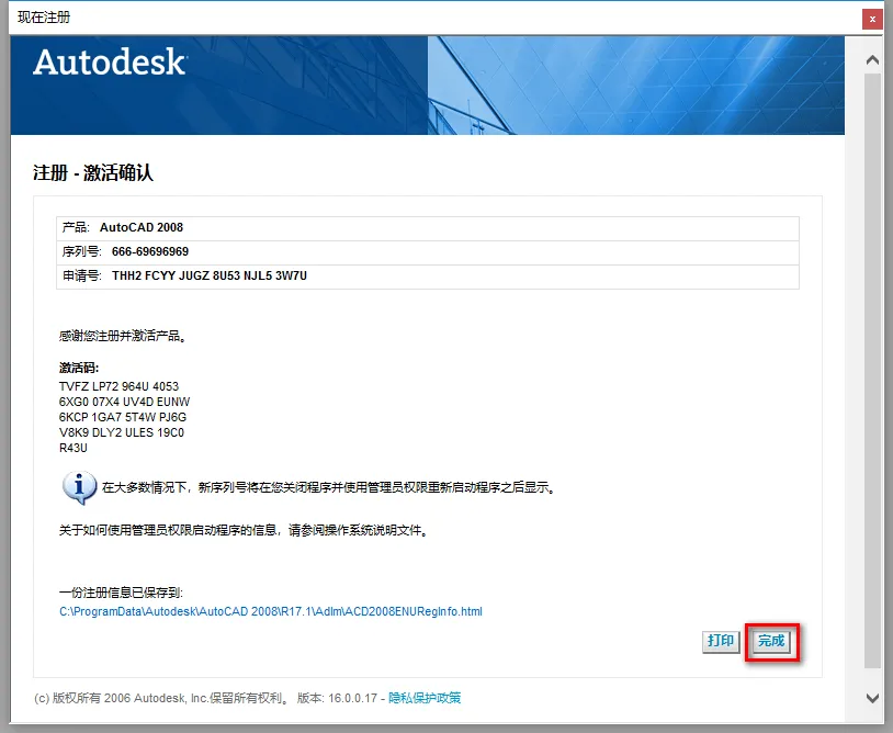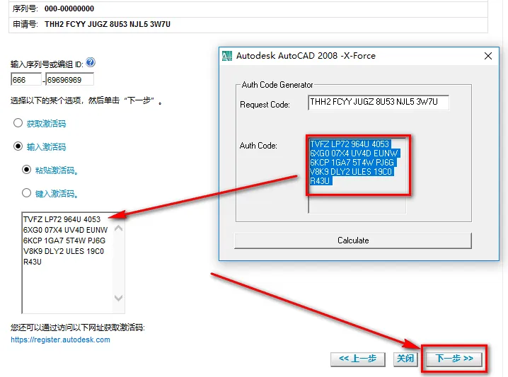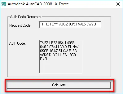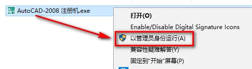20.选中AutoCAD-2008 注册机,鼠标右键选择“以管理员身份运行” ![]() 温馨提示:若打开没有注册机,说明被电脑杀毒软件隔离了,关闭杀毒软件重新解压即可。 21.将申请号复制到Request Code输入框中 注:复制和粘贴只能用快捷键"Ctrl+C"和”Ctrl+V” ![]() 22.点击“Calculate” ![]() 23.将生成的激活码复制到激活码输入框,点击“下一步” 注:复制和粘贴只能用快捷键"Ctrl+C"和”Ctrl+V” ![]() 24.点击“完成”