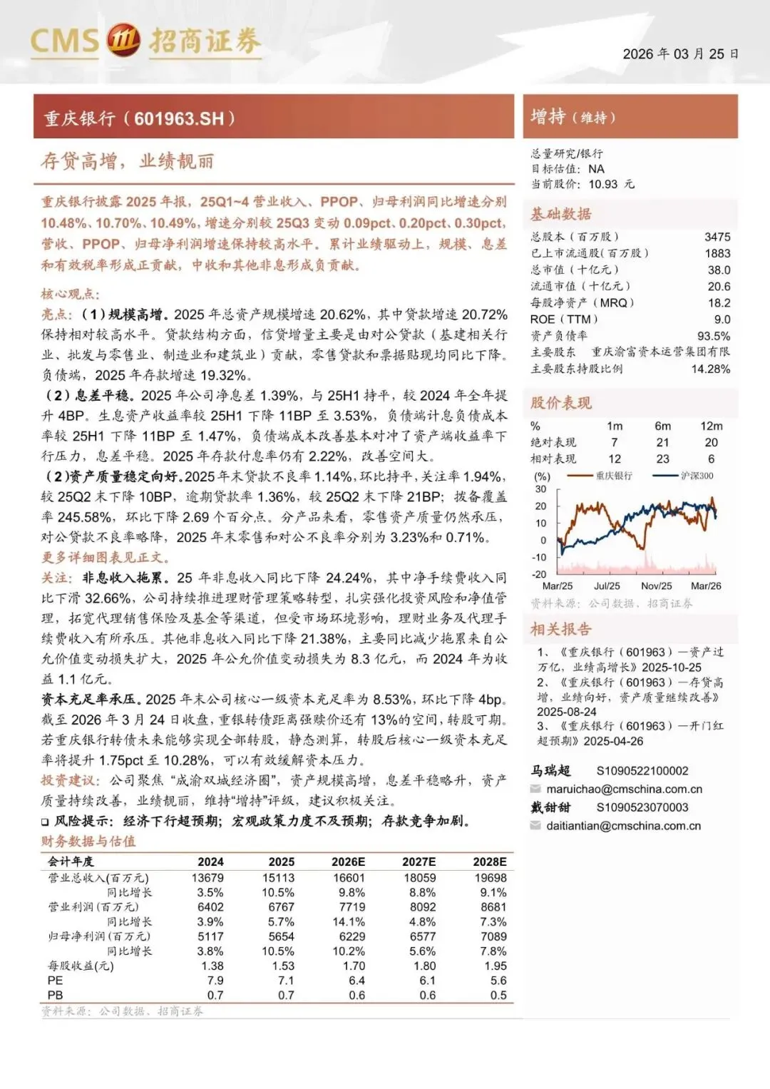重庆银行(601963)存贷高增,业绩靓丽-260325-招商证券-20页