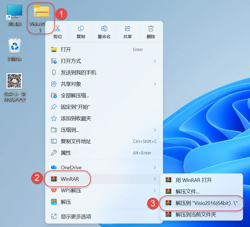 1.鼠标右击“Visio2016(64bit)”压缩包选择(win11系统需先点击“显示更多选项”)"解压到Visio2016(64bit)"。