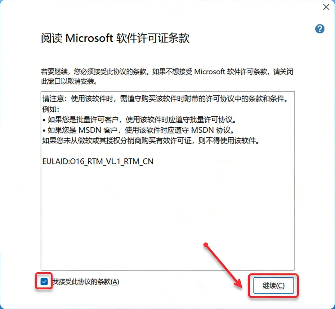 4.勾选"我接受此协议的条款",点击"继续"。
