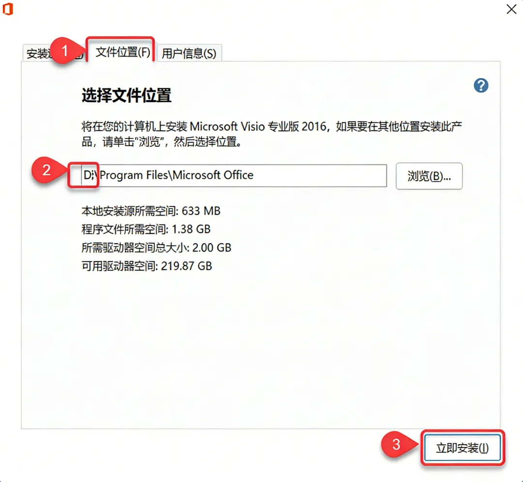 6.①点击"文件位置"②修改路径地址中的首字符C可更改安装位置(如:将C改为D表示安装到D盘)③点击"立即安装"。