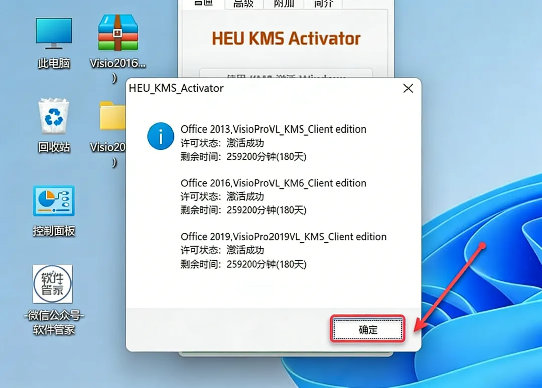 12.激活成功,点击"确定"(office产品目前没有永久激活,有效期180天,到期后用Crack重新激活即可)。