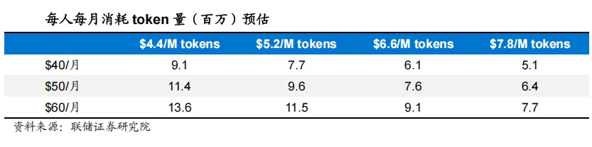 根据上述数据我们测算得到的结果如下所示,OpenClaw 用户每人每月消耗的token 量预计在 510-1360 万。