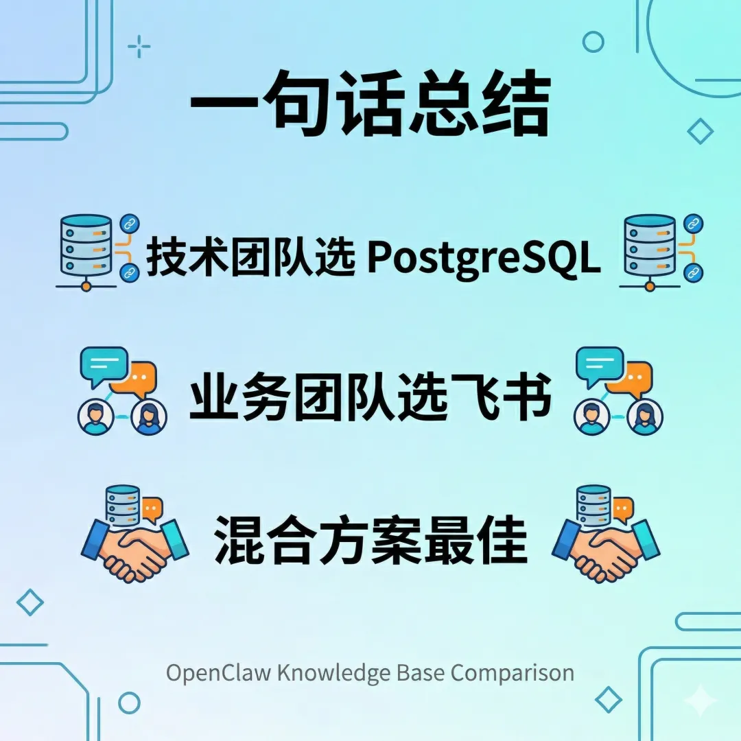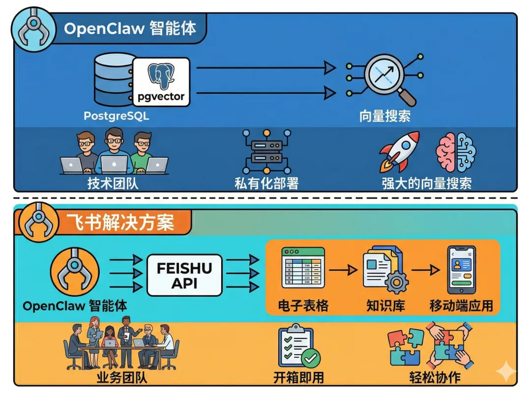 ┌─────────────────────────────────────────────────────────┐│ AI Agent 知识库方案 │├─────────────────────────────────────────────────────────┤│ ││ 方案 A:PostgreSQL + pgvector ││ ├─ 适合:技术团队、有 DBA、需要向量搜索 ││ ├─ 优势:功能强大、可控性高、支持复杂查询 ││ └─ 劣势:安装复杂、需要维护、学习曲线陡峭 ││ ││ 方案 B:飞书多维表格 + 知识库 ││ ├─ 适合:中小企业、飞书用户、无技术团队 ││ ├─ 优势:开箱即用、可视化强、协作方便 ││ └─ 劣势:功能受限、依赖 SaaS、向量搜索需额外方案 ││ │└─────────────────────────────────────────────────────────┘