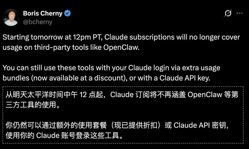 Claude Code之父Boris Cherny宣布:Anthropic已正式禁止使用自家套餐接入OpenClaw!!!