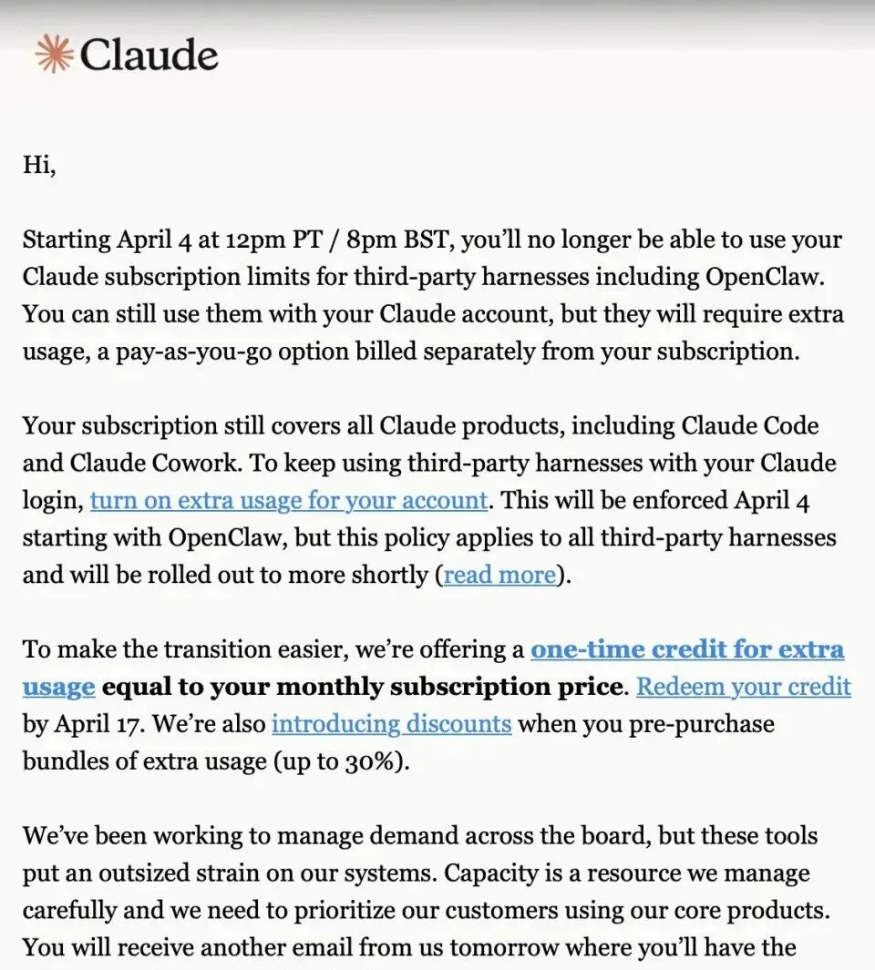 Anthropic给成千上万OpenClaw用户发出通知:明天起,你的Claude订阅额度不能再给OpenClaw用了,想继续,那就按量计费吧。