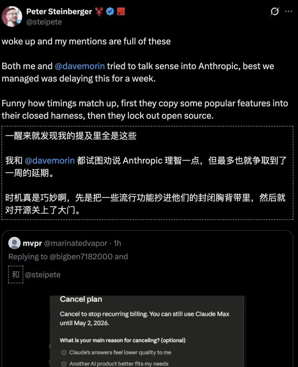 龙虾创始人Peter本人也无奈发声,暗示Anthropic「关门打狗」,「白嫖」开源社区: