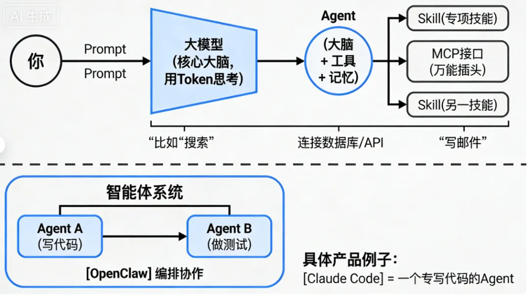 Agent是“装了手脚的大脑”,Skill是它的“专项技能”,MCP是“万能工具接口”。
