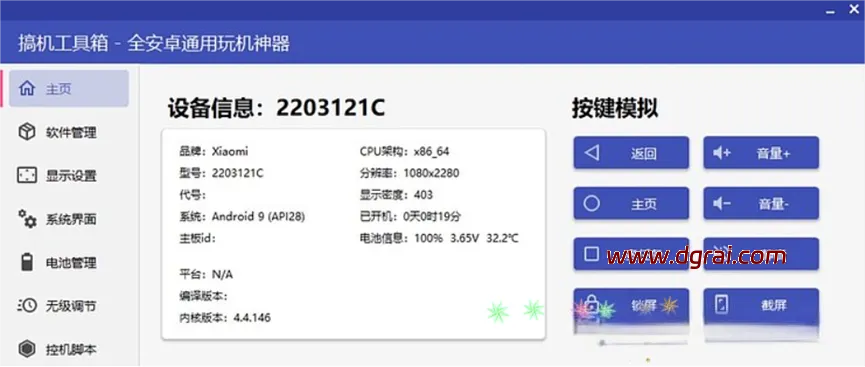 - 手机需要开启调试模式,一般是在手机的设置中,找到手机版本号,然后连续点击6次就可以开启开发者模式,然后在开发者模式中,开启调试。(如果不清楚怎么弄,可以某度按品牌搜一下,如何开启开发者模式。)(下载的软件包里有连接教程)设备信息:当手机连接成功后,我们可以从搞机工具箱界面中看到手机的相关信息,包括品牌、型号、系统、电池 等参数信息,而且还可以简单的对手机进行控制,比如音量调整,锁屏,截图,重启,关机等。在主页中,我们还可以进行 线刷模式(Fastboot)或者 恢复模式(Recovery)操作。