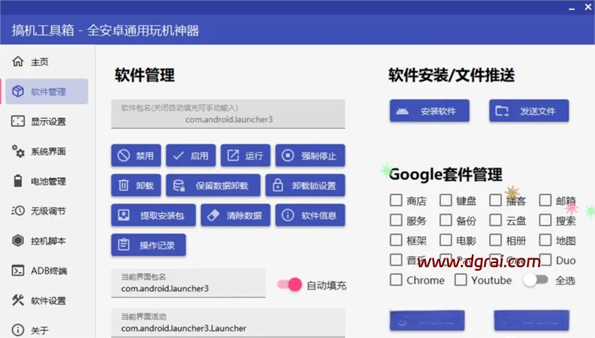 软件管理:我们可以对手机端的软件进行禁用、启用、强制停止、保留数据卸载、卸载锁设置、提取安装包、操作记录、清除数据等操作。还可以安装软件或者是发送文件操作。如果你喜欢谷歌服务,还可以在Google套件管理中,启用或者禁用各种谷歌服务,包括谷歌商店、邮箱、服务、播客等。