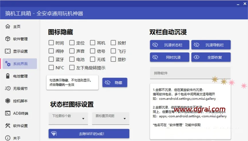 系统界面支持 图标数量设置,状态栏图标隐藏,状态栏/导航栏隐藏,去除无线wifi的x或!你还可以在双栏自动沉浸功能中设置沉浸状态和方式。