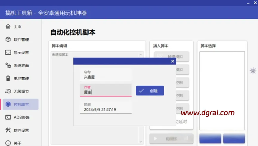 自动化控机脚本:在控机脚本界面,我们可以新建新的脚本,还可以插入各种实用脚本。如触摸模拟类脚本,按键模拟类脚本,软件控制类,系统控制类等。这些脚本无需编辑,也不用代码,都是内置好的,大家选择点击操作即可实现。脚本的运行还支持延迟运行和循环操作等。