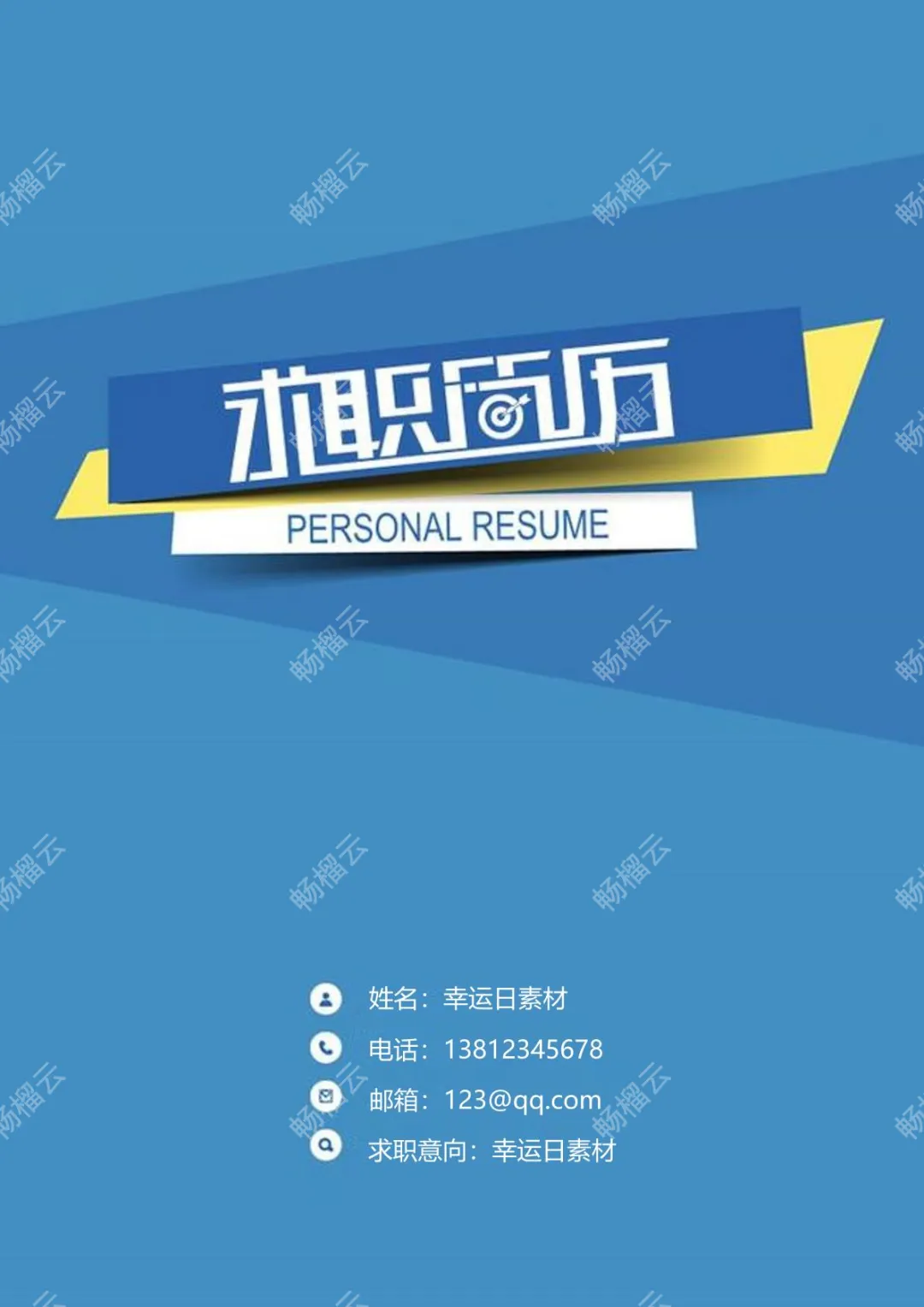 本文档包含幸运日素材的求职意向及联系方式,涵盖邮箱123@qq.com、电话13812345678等信息。