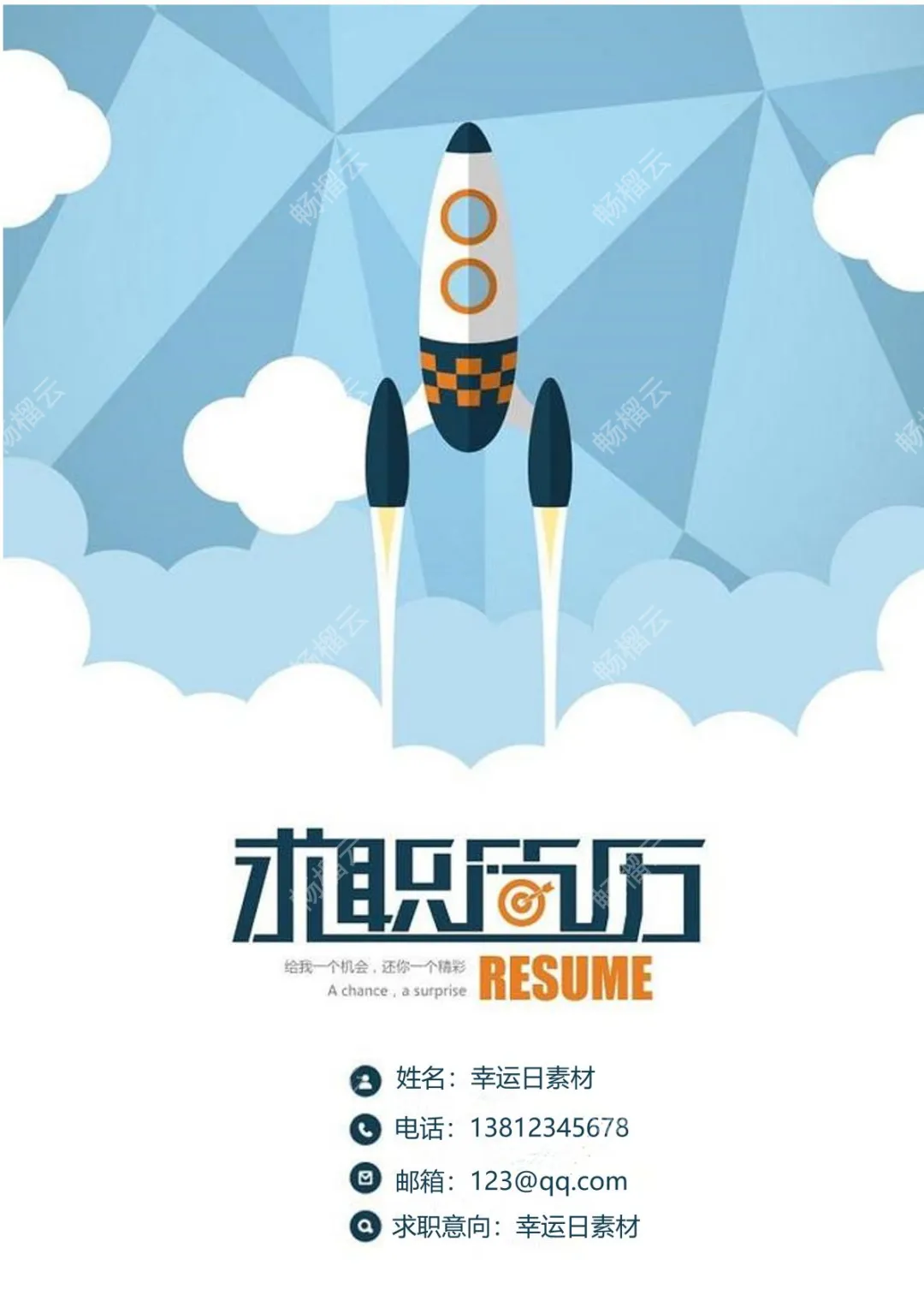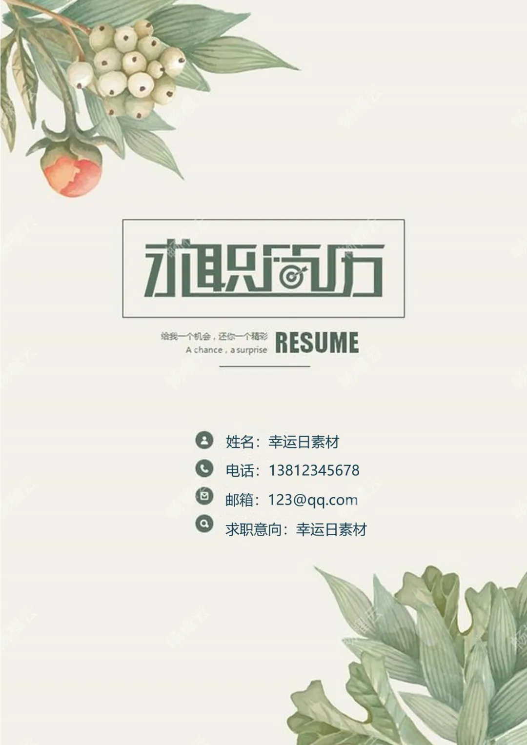 这里是幸运日素材的求职信息展示,包含联系邮箱123@qq.com与联系电话13812345678,求职意向为幸运日素材相关方向。