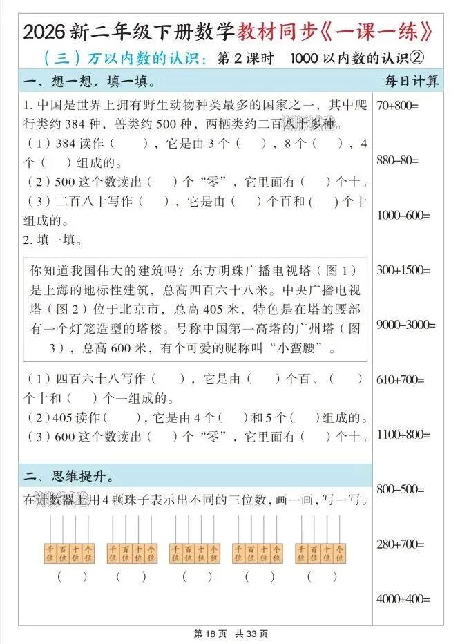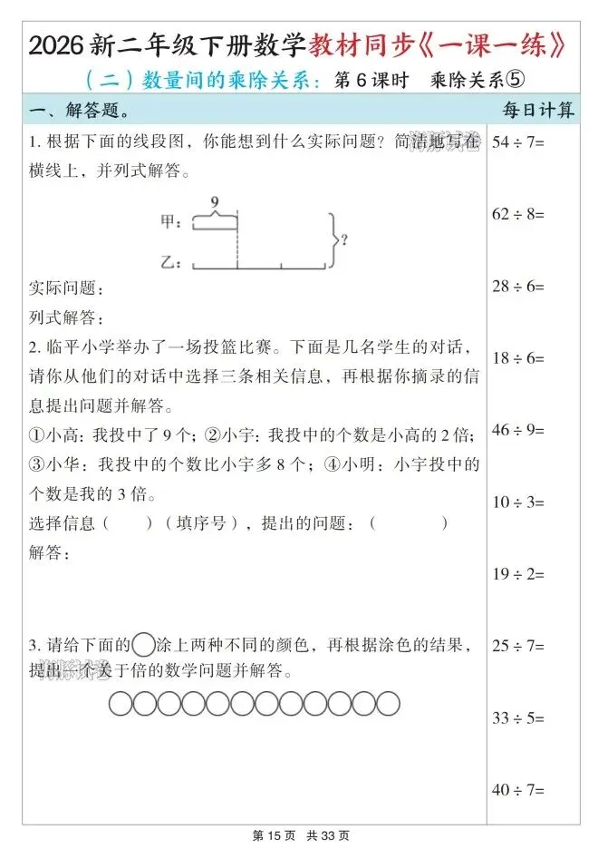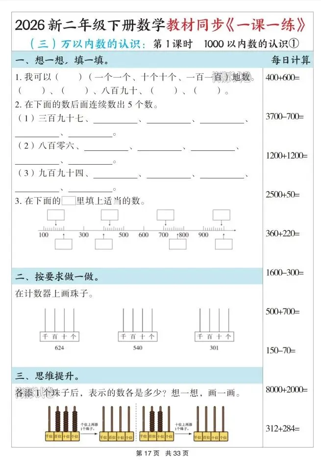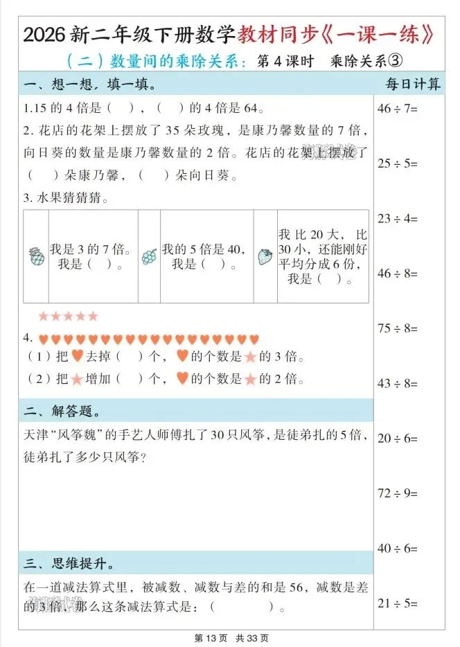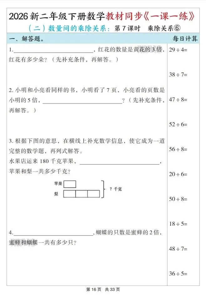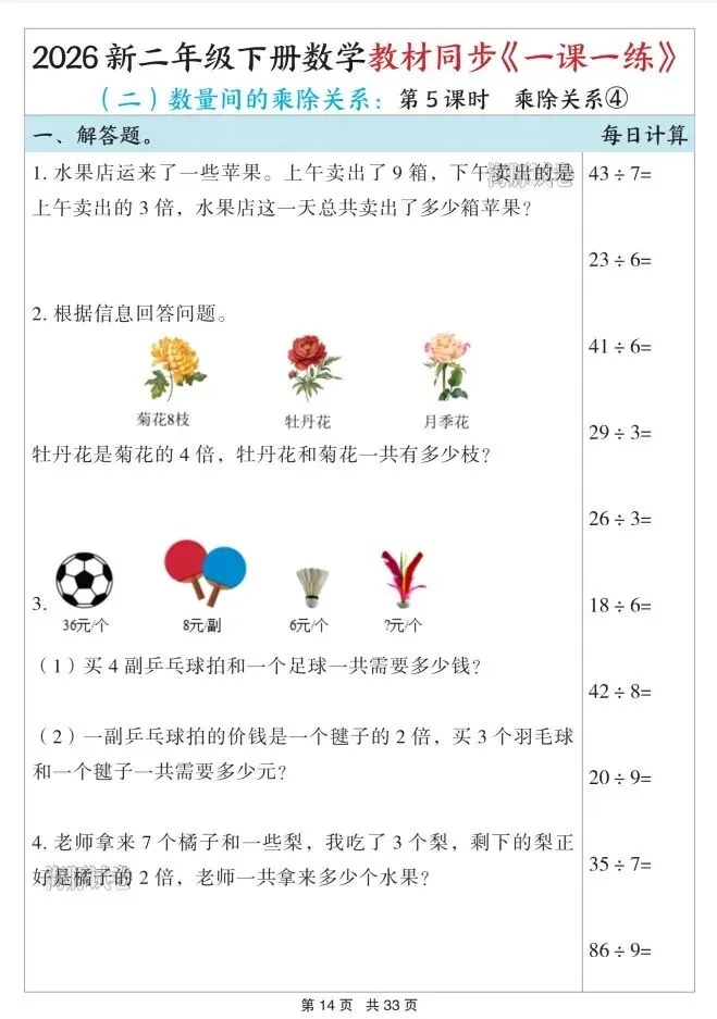 今天给大家整理了26春二年级数学下册教材同步《一课一练》,转发给朋友或班级群,受益更多人,帮助孩子学习!