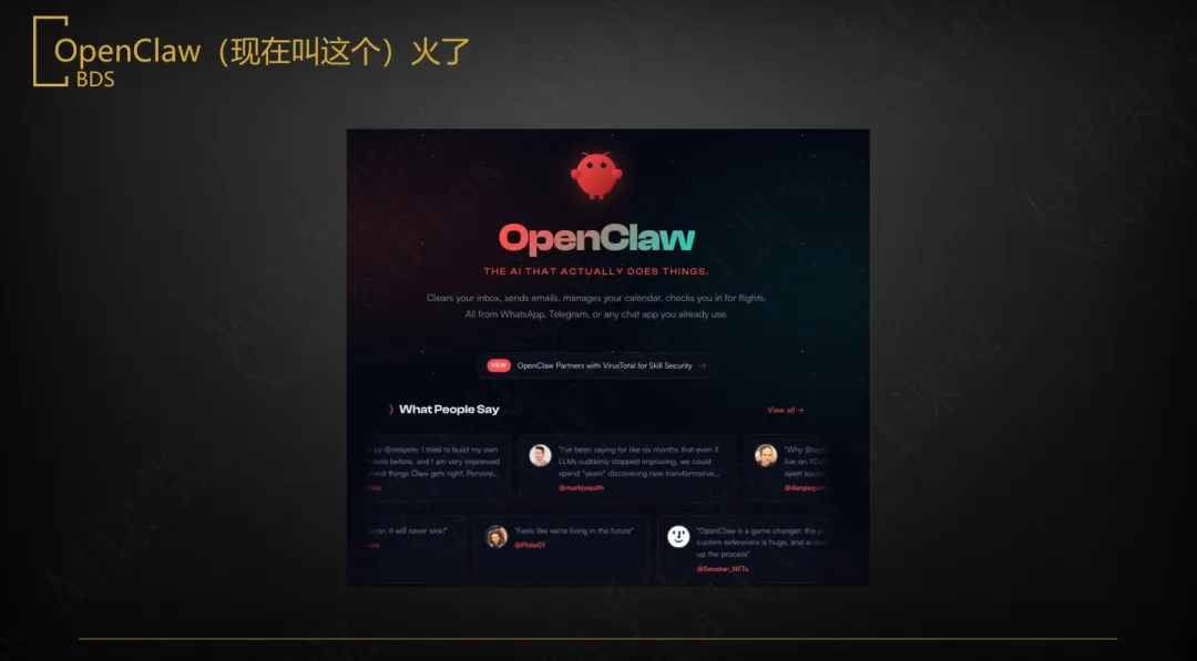 • 引爆点来自用户体验重构:相比Claude Code等开发者工具,OpenClaw通过接入WhatsApp、飞书等IM工具,打造“Bot给我干活”的直观感知,极大降低心理门槛,吸引大量非技术背景的“早期采用者”参与尝鲜。