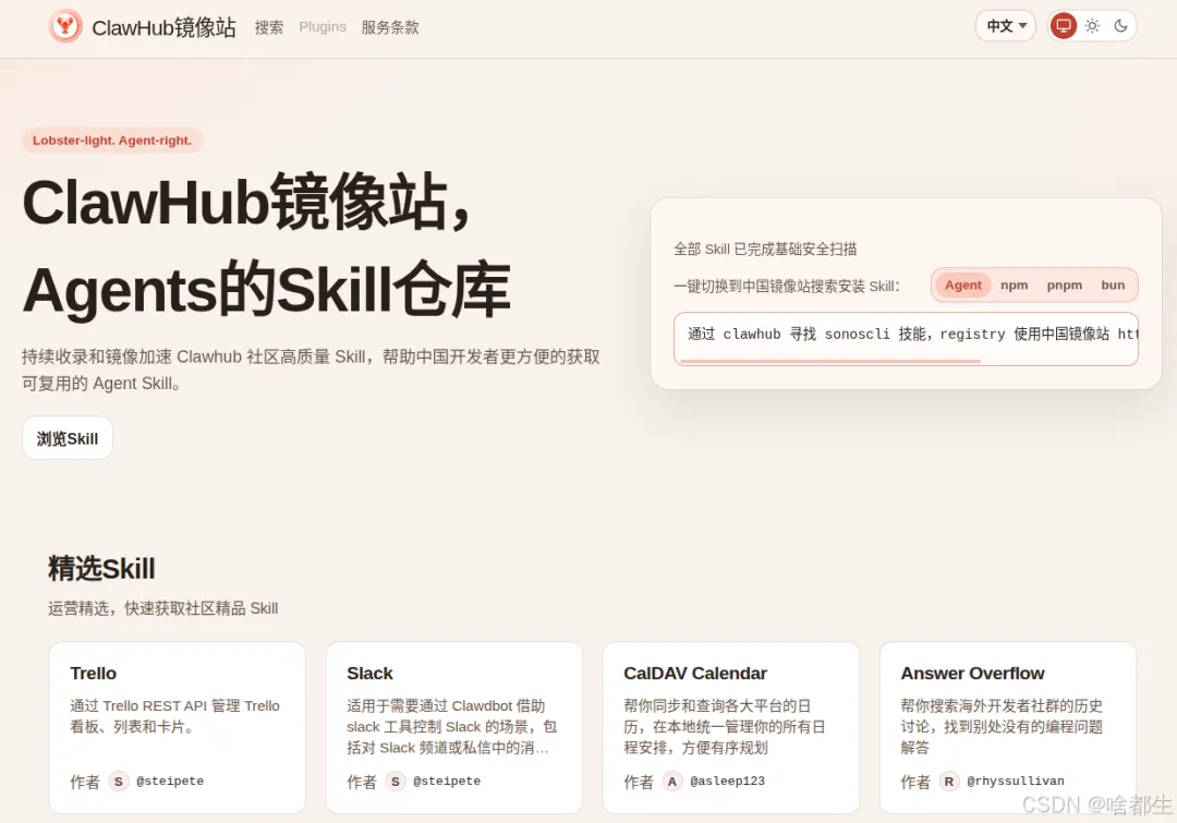 OpenClaw推出中国官方镜像站点ClawHub镜像站,由字节跳动BytePlus与火山引擎提供基础设施支持,旨在解决国内开发者访问原站速度慢、延迟高等网络瓶颈。该站点作为OpenClaw生态的“加速器”,持续收录并镜像社区高质量Agent Skill,提供完整的中文界面与基础安全扫描机制,确保资源获取的安全与高效。开发者可通过网页浏览、命令行工具或OpenClaw客户端直接调用,支持npm/pnpm/bun等多种集成方式,目前已同步社区精选技能如Trello、Slack管理及日历同步等,帮助中国开发者在本地化环境中无缝构建和运行智能体工作流