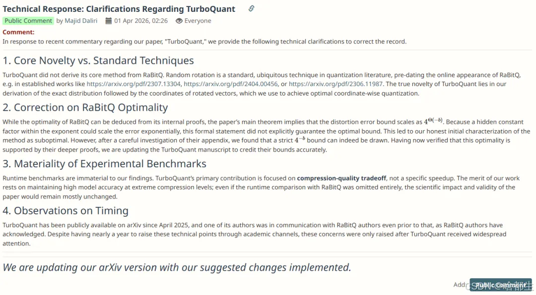谷歌TurboQuant团队针对涉嫌抄袭RaBitQ技术、错误贬低竞品及实验跑分造假等指控做出了正式回应,第二作者Majid Daliri在OpenReview上发布澄清声明,承认因未仔细查阅RaBitQ附录而误判其理论界限,承诺修正论文并致谢原作者,同时辩解称随机旋转属于通用技术,且引发争议的硬件性能对比(A100对比单核CPU)属于“非核心基准”,即便删除该对比也不影响论文核心科学价值;然而这一将核心技术归为“行业标配”、以“公关时机”反唇相讥原作者的回应,不仅未能平息风波,反而引发了审稿人及社区关于大厂学术傲慢与科研诚信的强烈批评与广泛讨论