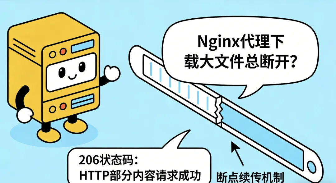 Nginx 代理下载大文件出现中断,是 代理缓冲、超时限制 + sendfile/tcp_nopush 组合的副作用 wget/curl 出现 206 Partial Content只是客户端断点续传的表现调整缓冲区、超时、支持 Range 就能解决问题